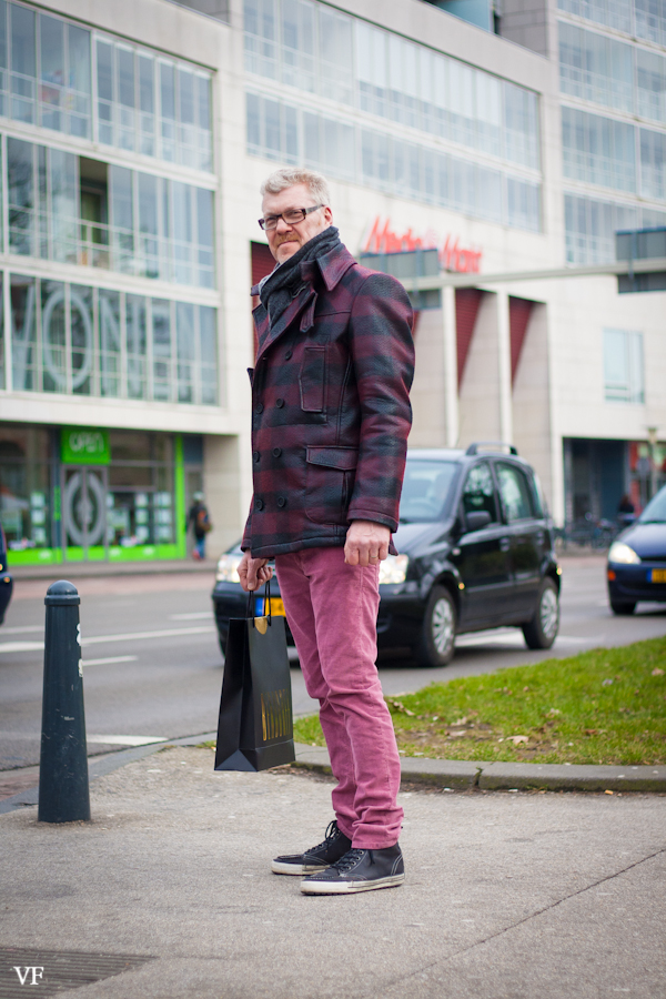 This saw the man from quite a distance so I really had to run to get this shot. I really like the effort, a good example of (older) men looking fashionable on the streets. Check purple coat, pink skinnies ..just a nice look. A nice and cooperative man who I like to see again on the streets someday.